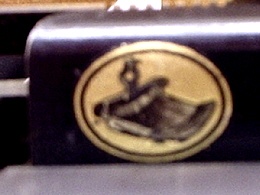 | Perhaps the most remarkable feature of the Blick 90 is its quickly removable type-baket. This is displayed clearly in the picture at right. Two thumb screws (one each side) are loosened, and with the carriage locked in the FIG or uppermost position the type basket can be lifted up slightly, then brought forward clearing the ribbon spools and moved toward the typist out of the machine. Insertion is made easy by cast-in tangs that positively locate the segment, assuring alignment prior to tightening of the screws for securing it back in place. (Note that the emblem on the paper table is simply the type-basket, removed.) |