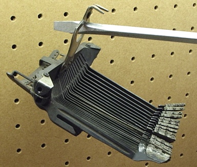 | At left, the type basket being supported by a screwdriver for closer inspection. The type basket has a riveted label below the mount of the type alignment fork stating PICA, and has on its rear the number 726 stamped in. Note that the type-bar return springs are mounted on the rear of the segment. The type-bars appear non linear in the photo above because the unit is simply sitting on the shop table and the lower extensions of the center type bars are supporting its weight, forcing them upwards. Note that at right they are in-line as if they were installed in the machine. |