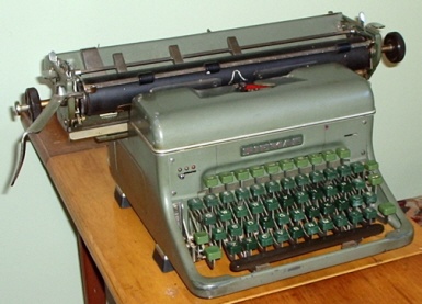 | SIEMAG MODEL II T / Davis collection This machine is representative of the top end of Siemag machines, with long carriage and ten-key decimal tabulator. It is serial number 057175 II T, and dates to 1952. Not easily discerned in photos is the fact that this machine has a quickly removable carriage. The side panels are released by catches located under the machine, giving access to the locking levers for the carriage plate. The carriage is then lifted upward with its rail and drawband. Replacement is just as quick and easy, allowing for interchange of various carriage widths. This may have been a significant feature, considering the shortage of all typewriters at the time; one machine could operate with multiple carriages, obviating the need for several separate machines. |