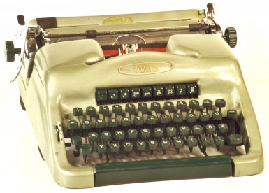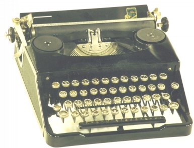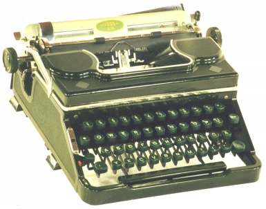 | Two different body styles were produced in the 1950's, and it is still not entirely certain which of these came first. One of them employed a rather conventional one-piece lift-off ribbon cover, while the other (much more famous) design employed gull-wing ribbon spool cover doors. It is now assumed that there was some concurrent production of the two styles, but that the units with one-piece cover lasted longer. We will examine the style with one-piece top cover first. |