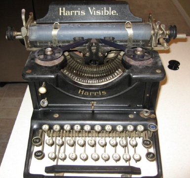 | At right, we see a machine from the collection of Tilman Elster. This is his Harris Visible No 4, serial number 15430. It has no ribbon selector. It does include the reference to Harris Typewriter Manufacturing Co. in the decal on its frame. |