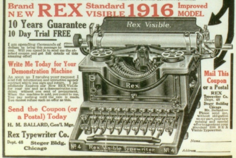 | Jim dax has sent much ad copy, and the clip at left is from a 1916 ad for the Rex Visible, and the Rex Typewriter Company. The ad has much fascinating information. The general manager of the company, a Mr. Ballard, states that he's been in the typewriter business for twenty years and has never offered a machine or deal like this. He notes that the Rex is not a toy, and is as expensive to manufacture as the common $100 standards. Lack of any dealer network allowed a much lower price. Solicitations like these were used to sell the machines. The machines also had an unparalleled ten year guarantee against defects. |