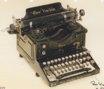 | Tilman also sends this shot, of his Rex Visible No 4, which unfortunately is missing its paper table. However, of great interest are the side mounted, knob type ribbon selectors and the label on the frame stating that it was made by the Rex Typewriter Company. This machine is serial number 8407, and was the first shot sent to us that matches the machine seen in the Rex advertisement seen at the top of this page. |