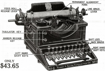 | The name "Harry A. Smith" is familiar to typewriter collectors, as this man bought production of numerous machines from bankrupt manufacturers and sold the machines under his own name. Perhaps he even sold rebuilt ones, too; in my research about this man, all I turned up was the following very interesting reference, in a 1918 Federal Trade Commission report. "Complaint Number 36, February 1, 1918. Federal Trade Commission vs. Harry A Smith. Causes: Stifling and suppressing competition in the sale of typewriters by publishing and causing to be published false and misleading advertisements designed and calculated to cause customers and prospective customers to believe that the repaired and rebuilt typewriters of standard makes offered for sale at a price of less than one half of that charged by the makers of such machines are new typewriters in alleged violation of Section 5 of the Federal Trade Commission Act." He wasn't alone here, either -- complaint number 34 against the Dearborn Typewriter Company, and # 35 against the Metro Typewriter Company, were filed along with this one. The same complaint would be filed against "Block & Emporium" ten days later. Perhaps Smith was really in the business of selling rebuilt typewriters for the most part, and only bought up the remaining machines of dead manufacturers when they became available. Perhaps these Smith No 6 machines were actually used -- note that Sears claimed owning 800 Harris units in 1914. |