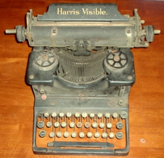 | This is, seemingly, thrown out of consideration when we examine my first-found Harris Visible No. 4, seen at right. It is serial number 106723, which places it between the other two seen above. It does NOT carry the Rex name on the front frame, but the Harris Typewriter Mfg. Co. name. Like the other two, though, it doesn't have the elaborate decorative pinstriping and so forth that many Harris machines have. This discovery, coupled with further findings in known serial numbers has led to the beginning of a complete examination of the Harris and Rex machines chronologically by serial numbers and advertising to determine just what the variants are. We will attempt to briefly discuss these below as we see them here. |