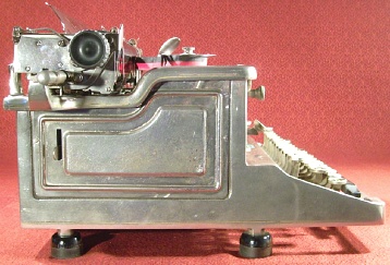 | Rex was trying, obviously to add some competitive value to its machine by developing a more conventional ribbon selector control and by making a model that typed two more characters. Obviously, not too many of these were sold even though Rex tried for a while; the two known Rex Visible No. 10 machines are about a thousand serial numbers apart. In that sense, then, this newly-found, third No. 10 variant is highly unusual. |