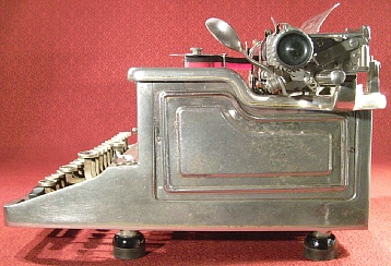 | National Typewriter No. 10 -nickel plated- serial 52126 Thomas Fuertig collection Our first view (and I bet Tom will be surprised that I still have it) is one that he sent when he first found the machine. I show it here for two reasons; first, this is an important machine for collectors due to its rarity, and second to show you what a fabulous job Tom did in restoring the original look of the machine. Collectors familiar with the Harris-Rex line will already be agog at this machine; those who are not may require some description in order to fully understand just how amazing this machine actually is -- and to understand why it seems to bring up more questions than it answers. We will begin with the model number of the machine first since it's easiest to explain. |