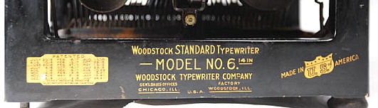 | Woodstock No. 6 s/n J100578 Don Sutherland collection Don Sutherland's very first contribution to the site is this surprising machine; it's clearly labeled as a No. 6 model, with 14 inch carriage. This contradicts the serial number lists which indicate wide carriage machines having a serial prefix of "8." Jim's machine above has a "B" prefix with wide carriage and is a No. 5; this machine has a "J" and is a No. 6. It's the only Woodstock No. 6 we know of at the moment (February 2008.) |