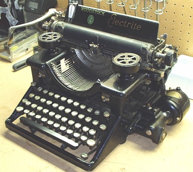 | Our next project is this Woodstock Electrite, which when introduced in about 1924 was well ahead of its time. Most of the world wasn't ready for an electric typewriter yet, and the Electrite sold only very modestly. This makes the Electrite somewhat hard to find today. This machine has an interesting back-story; I spotted the machine on e-Bay, listed as "keys from Woodstock typewriter" and looked to see the machine, if pictured. The keyboard area was pictured, but on the right I could see a projection in the correct place for a motor housing were it to be an Electrite. Contact with the gracious seller resulted in completely new photos being posted for the auction and the offer of the machine in whole. The front frame was broken off, though; I asked the seller if the piece was there. It was, and I won the machine in the end. Here you see it in the conditon received, exactly as requested; the frame piece taped on to protect the key levers in shipping. It worked perfectly. |
