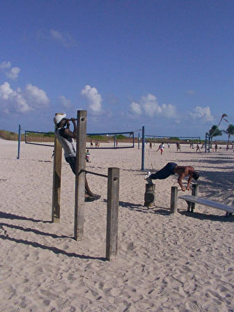 Doug showing his muscle at the pullup bar on South Beach. I think he did about 15, but it wasn't easy. Beside him, a local muscleman does his stuff.