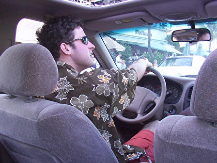 Here I am crusing in the Kia Optima we rented for the weekend. It was actually a pretty nice car, with a sun roof, CD player and V6 engine (kind of like a Nissan Maxima). Traffic was pretty congested in South Beach, with so many people "cruising" along the main drag. There were signs that said "Crusing Prohibited When Light Flashing." |