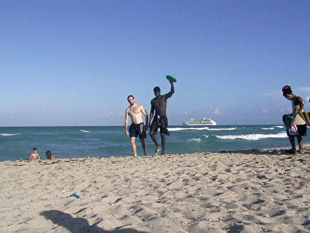 Doug and Corey returning from throwing the frisbee at South Beach. Doug insisted we get a frisbee and so we did. None of us were the best frisbee throwers and we occasionally hit some people (or at least came real close). Also, in the background, you can see a cruise ship. We saw several of these large boats leaving from the Port of Miami. |