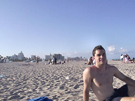 Steve just chillin' on the beach. Behind him, a few of the hundreds of high rise hotels rise along the coast. In this particular area of South Beach, many of the hotels are built in an Art Deco style. |