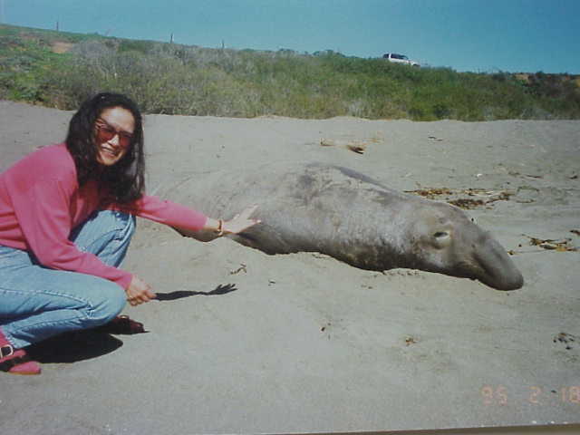 Aster makes another friend; an Elephant Seal on a Northern California beach. |