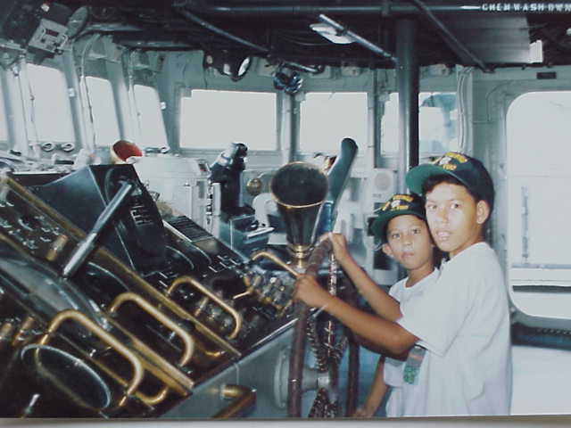 Nephews Jeffery & Jingo at the helm of USS FRESNO, pierside Subic Bay Naval Station. |