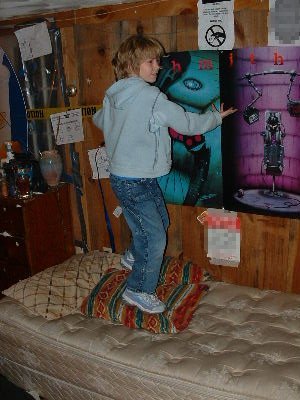 As you go to your right, you will see my bed. Nicky is showing how nice and bouncy it is. There is no sheet on it, and the blankets are on the floor from that morning. I have about 5 blankets. Its cold in the cellar. |