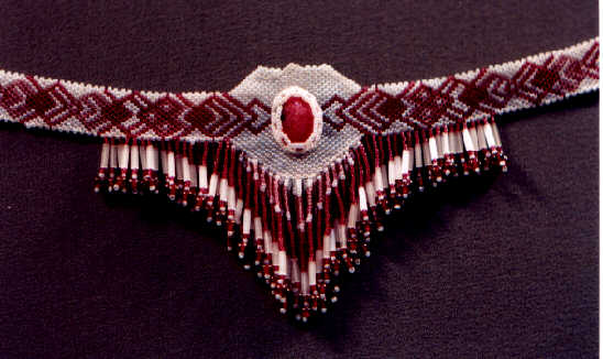 This choker was made using Japanese beads size 15/0. It took me about 70 hours to create. Which does not include designing time. The stone in the center is called Rodonite. It was done using the brick stich. After carrying it around for a year and two months showing it off as my center peice I sold it for $250.