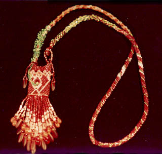 I used because it is very flexable and comfortable to wear, not being stiff or scratchy. At the base of the strap, I experimented with loops to join the bag and strap on one side and tried other methods of attachment on the other side. I used a square stich on the left side, when I finished I didn't like the way the string showed with the square stitch so I desided to add some vines. I searched high and low for spring green transparent beads, the tiny ones, finally at the gem & bead show I found some at last. On the right hand side of the strap, I used an African helix stitch, I experiemented quite abit with this area, with beads of different sizes, the color combinations and number of beads used. I'll take some close ups next time I pull out the camera. Created in Sept of 1998, it still graces my cases attracting attention waiting for the right person to come along and buy it.
