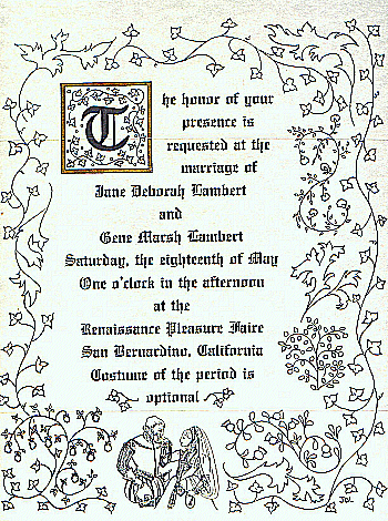 I drew the floral border, using some books I found in the library about illuminated manuscripts. The couple was adapted from a black and white picture I found in a costuming book. The text and my finished artwork was type-set by a local printer. To save money we purchased the our own card stock from Kelly Paper which we provided to the printer. Kelly Paper is a local supplier of paper and card stock to printers. We also purchased matching envelopes from them. ![]()