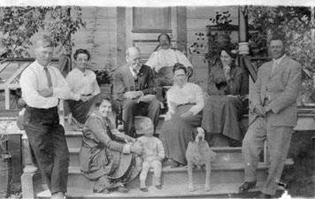 L to R: Chris Fredson, his mother Sophie (Thomsen) Fredson (in white shirt), his wife Geneva (Eagle) Fredson (seated in front), their son Leonard. Chris' father, Israel Fredson, is in back, wearing suspenders. Other people unknown.