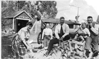 L to R: Geneva Fredson (petting the dog), Israel Fredson (against the car), Chris Fredson (on woodpile), Chris and Geneva's son Leonard "Len" as a toddler. Man holding him unknown.