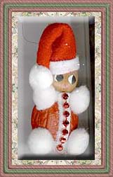 Glue bottom strip to walnut and then glue sequin strip from the top of the walnut to the bottom strip. Cut a triangle shape of red felt to form a santa hat and cut a small strip of white felt and glue to the bottom of the hat.