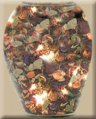 For a small vase a string of about 35 mini-lites will work fine, but you can use as many lites as necessary. Place your strand of lights in the vase leaving the end that connects to the outlet hanging out of the top and over the top edge. Place a little pot pourri in the vase and move your light strand around the glass filling with pot pourri until your vase if full. The arranging of the lites will take a little time, but these vases look spectacular when completed.