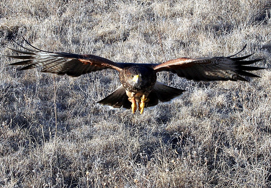 I am flying a male Harris Hawk out of my Crash line. He is the tamest HH I have ever seen and I have been extremely pleased in what I have seen. I carhawked him some, and we could really run up a ridiculous headcount that way. He required only one baggy and to be honest, I could have caught something out the window without a baggy. He was TROUBLE on the local cottontails. He has caught a couple of jacks now and has no fear of them. He is SO tiny to be catching jacks regularly though. He had snagged a couple of Texas bobwhites and has almost caught a couple of pheasants. He is vocal and I hate that, but those are results of some choices I made I guess. I hand fed him when I moved to Texas as I was building facilities for a week and I pulled him for a couple of days at 9 weeks and then pulled him to hawk at 14 weeks. He is really as tame as a dog and I fly him with no jesses, bells or telemetry. We are already over 50 head of game even with my back surgery in November. I am going to sell him and am either going to fly a female(hopefully his sister from the next clutch) or I will try a goshawk for the first time |
