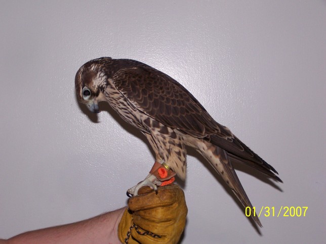Well, I don't know what to say except that a personal situation has caused me to have to abandon all of my plans for this season. I will update this as I go along, but for now, I will be flying this little pere x prairie falcon I lost Nolan after he specked out and stooped hard on something just in bino range. My transmitter failed on impact and I never saw him again. So I ended the season with a pitiful few head of game in the bag and minus a falcon I sold, a great dog I sold, and a falcon I lost. I also didn't get to run Deke under the birds hardly any, because I never gained any momentum this season. It has been a humbling experience to say the least. |