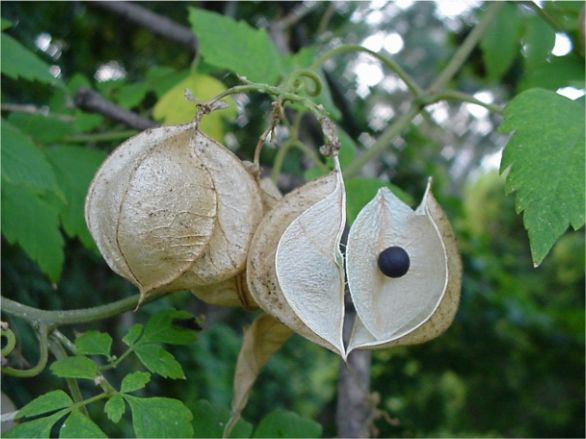 CATEGORY: 1 CONTROL: DESCRIPTION: Now a serious invader in many parts. A vigorous, vine-like climber with a spread of 6m or more; hairy leaves/stems; white or yellow flowers grouped together in clusters - pleasant smelling with two tendrils at the base of each cluster; fruits a large round capsule; seeds round changing from green to black when ripe with an oblong white spot (hilum). Reproduces only by seed. Flowering time: October to January (all year round in some places). ORIGIN: Originates from tropical and sub-tropical South America. Probably introduced into South Africa as an ornamental. First recorded in KZN at Eshowe in 1937. WHERE FOUND/PROBLEMS CAUSED: Where it occurs, it forms dense but localised infestations. It can grow to enormous lengths and is capable of smothering a tree 10m tall. Competes with and smothers indigenous plant species. Invades forest margins, watercourses and urban open spaces in subtropical regions. DID YOU KNOW: Its name is derived from the Greek kardia (heart) and sperma (seed) referring to the heart-shaped white spot that marks each black seed.