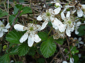 CATEGORY: 1 CONTROL: DESCRIPTION: Leaves have 3 leaflets (sometimes 5) with toothed margins; flowers white, rarely pink; fruits consist of 40-50 tightly packed parts going from green to pink to black and succulent when ripe. A deciduous perennial scrambling shrub with slender stems (canes), which bear curved thorns and only live for 18months. Flowers October/November and fruit only develop in second summer and then cane dies. ORIGIN: It is presumed that bramble was introduced into South Africa from North America in the late nineteenth century for its fruit. WHERE FOUND/PROBLEMS CAUSED: Favours cool, moist areas. It usually occurs in small patches and also along fence lines or contour banks. Invades grasslands, forest edges and plantations. In plantations the thorny canes form dense impenetrable barriers restricting the movement of workers and equipment; infestations in veld reduce grass production and restrict the movement of animals. DID YOU KNOW: American bramble can be distinguished from indigenous Rubus species as its ripe fruits are large, shiny black berries and it has 3-5 and not 5-7 leaflets. This page was last edited on 22 April, 2006 | |||||||||||||||