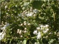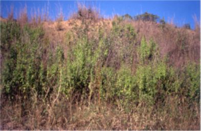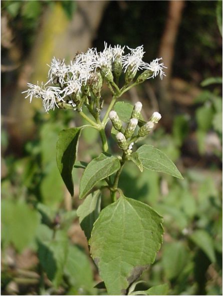 CATEGORY: 1 CONTROL: DESCRIPTION: Triangular, pointed leaves with three conspicuous veins; leaves smell strongly of turpentine or paraffin when crushed; tufted mauve to whitish flowers (A single flower) in clusters; perennial shrub but a scrambler when it grows among trees. Often form dense thickets. Flowering time: June, July and August. ORIGIN: Originates from a wide area of South, Central and North America and the Caribbean. The exact origin of Chromolaena in South Africa is unknown. Reported to have been introduced into KZN in the 1940's through Durban harbour. WHERE FOUND/PROBLEMS CAUSED: Along the KZN coast below 1000 m, but is particularly invasive below 600 m. Thrives where vegetation has been disturbed or neglected. Spread restricted by frost; it survives frost but will not flower. Competes with and replaces indigenous vegetation; hinders operations in plantations causing increased production costs of timber; increases management costs in nature reserves; forms solid unsightly stands. Will even invade undisturbed areas and spreads virulently.