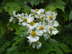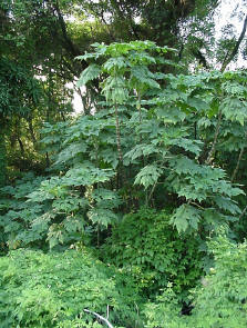 CATEGORY: 1 CONTROL: DESCRIPTION: Erect, little-branched shrubby perennial. Stems square; leaves large, hairy, hand-shaped and deeply lobed (A); flowers dahlia-like, white with yellow centers borne in clusters; reddish-brown seeds borne in the rounded, papery, old flower heads (B). Flowering time: May to October. ORIGIN: Originates from an area extending from Guatemala to Costa Rica. WHERE FOUND/PROBLEMS CAUSED: Mostly in shady habitats along the coast below 650m. Favours drainage lines, streams and open patches in disturbed forest areas. Grows rapidly and is difficult to control. Invades forest, woodland, bush clumps, roadsides, riverbanks and disturbed sites. DID YOU KNOW: Can be confused with M. bipinnatifida, which is grown as an ornamental and has not shown signs of escaping. It is more tree-like and its leaves are more feather-like and not hand-shaped like M. hibiscifolia