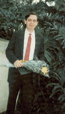 | This is Danny standing in front of a flag. The flag is Bob's father's funeral flag. This was taken when we first started dating. |