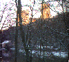 A photo of Durham Cathedral glinting in the sunlight of a snowy December day in 1995, taken through the trees that grow on the banks of the River Wear...