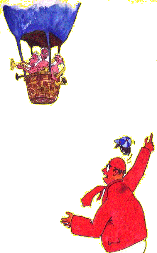 Above the pitch the boogie balloon soared. It's jazzy raz-ma-taz was loud and zed, The rain pelted down and the wind blew so strong that Dick's wig was blown off his head! The bugaliens saw this and started to jeer As Dick picked it up from the mud, Bob the bugalien saw this and shouted down, "You'll have to buy a new one, m'lud!". |
