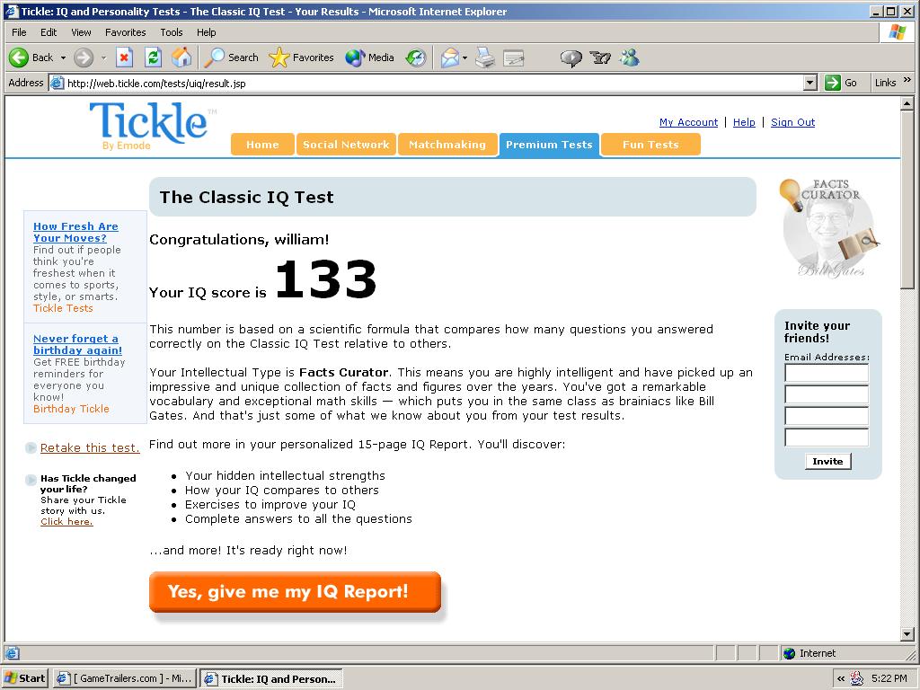 March 05.2004My IQ Test results I mean we all knew that I'm smart. Quit Toys R Us because making 160 dollars a month will not pay bills. So I'm going to get another job and wait for our inheritance to come in. Happy days.