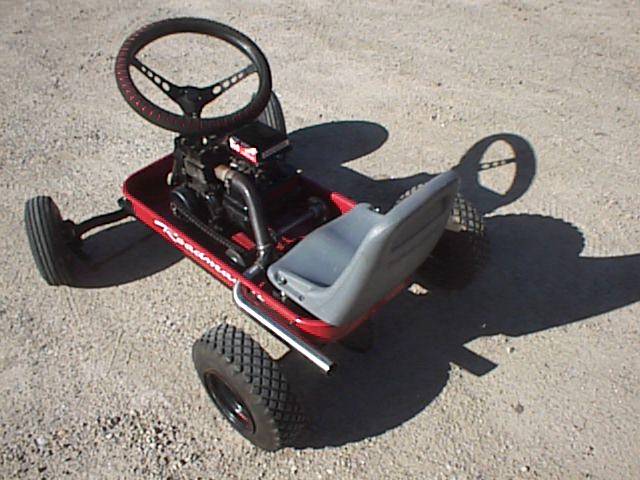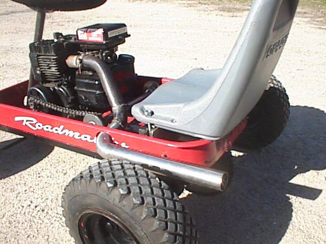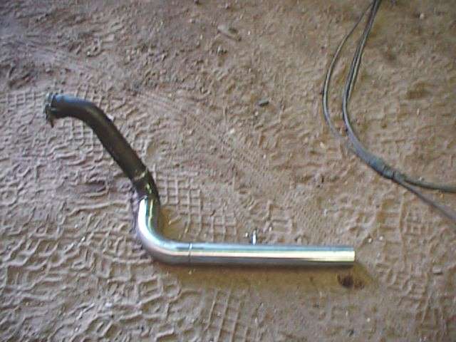 I got a little sick of having the exhaust pointed directly to me so I decided to make a header. I wanted it to enhance the look of the dirt tracker while looking a little bit flashy. Off to the metal pile I went. I found a piece of 2" stainless pipe with a bend in it already first. Then I found another piece of 2" pipe that had close to the right amount of bend. I only had to make two cuts and welds to get it to fit. I had bought a race header but decide for ease of assembly to just slip the pipe of the existing muffler. This also gives me some give in the muffler pipe so I dont stress it. Especially as I bolted the pipe to the wagon body so it would not flop around. I drilled the stock muffler out to 3/4 inch which is about the stock outlet anyway. It has a really neat sound now. A little rough but still muffled. |