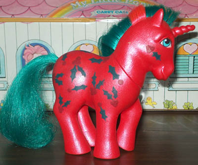 This is actually my favorite custom so far. She is a Twice-as-Fancy Christmas pony by the name of Holly (very original). I'll bet you can guess who I made her from. Poor Gusty was so discolored and glitterless that she needed a new life. I left her hair (you'll find that I do that a lot) and painted her metallic red with acrylic paints. Then I very carefully drew on her symbols with a pencil and then painted them in. Pretty basic. Now she joins Merry Treat and Baby Stockings during the Christmas season.