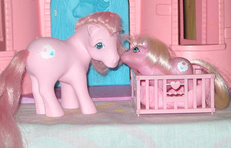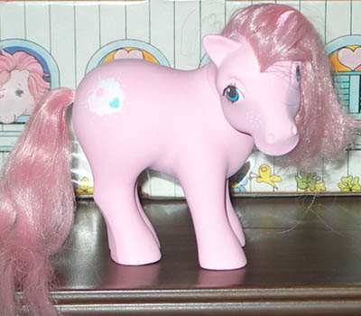Awwwww....aren't they cute together? I like the idea of making parent ponies for the baby ponies and vice versa. Mommy Tiddley Winks was made from a marked up Sundance. I left her original hair in and painted her pink with acrylic paint. Then, I drew her symbol on with gel pens (might not have been the best utensil to use, but it worked). Now Baby Tiddley Winks is no longer an orphan!