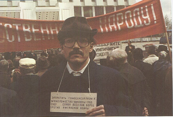 There was one rather unique individual vying for attention. He had a sign around his neck, and was more than happy to post for pictures. The second word on the sign is 'Gomasyeskualeezm', so I figured he was either passionately for or against gay rights. It turned out he was against, but nobody was paying much attention. Until recently, homosexuality was a punishible crime in the Soviet Union.