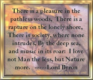 | We Rustled through the leaves like the wind, Left shrubs and trees and wolves behind; By night I heard them on the track, Their troop came hard uponour backs , With their long gallop wich can tire The hounds deep note and hunter's fire : Where'er we flew they followed on, Nor left us with the morning sun; Behind I saw them scarce a rood, At daybreak winding through the wood, And then through the night had herad their feet, Their stealing, rustling step repeat. George Gordon Lord Byron From Mazeppa |