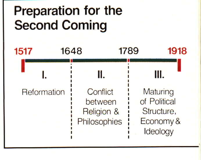 The History of Restoration did not, however, conclude with the coming of Jesus, because, as we explained in “The Mission of the Messiah”, he was rejected and killed. As shown in the history of Christianity, the events and time periods bear parallel patterns to the time periods of the Old Testament history (Abraham to Jesus). These are due to the fact that the mistakes made in each period of the Old Testament had to be indemnified through the New Testament history so that a successful foundation can be made for the Second Coming of the Messiah, on earth. The last 400 years of the New Testament history is therefore called, “Preparation for the Second Coming”. This period was concluded 400 years after Martin Luther’s Reformation (1517), and providentially coincided with the end of WWI (1918). According to God's timetable, the foundation for the birth of the returning Lord ("Son of Man" according to Jesus -Mt.24:36; Lk.17:30)was firmly established.