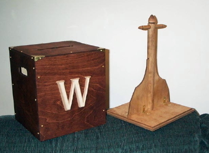 | Made for a poker buddy of mine to keep his chips in order. Logos display his undergraduate and current pharmacy school universities. Chip racks fit snugly up both sides of the handle, while the top slides over them and locks on to a dado slot on the bottom. -1/4" Birch ply sides and top-mahogany stain -3/4" Birch ply bottom-cherry stain -Poplar dowels-cherry stain -Logos- poplar on oak -Brass screws and brass corners |