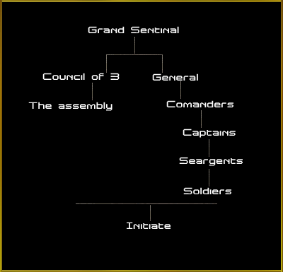 Grand Sentinal- The supreme leader of the clan, has absolute power. General- The General of the military, a part of the council of three. Leads raids, and attacks on the hordes. Helps create battle strategies, formation layouts etc... a position only for a very skilled warrior, and strategest. Commanders- There are 3 commanders in the military, they each govern their own legion of troops. They can also help with battle strategies, and play a key role in the military aspect of the guild. Captains- Each commander has 3 captains, that he/she will appoint, these should be very skilled warriors. The captains will ussually lead a small force of troops, and play key roles in the strategy for battles. Seargeants- Soldiers that seamed to stand out are promoted to Seargeants, this is the first step in moving up the ranks in the military ladder. Soldiers-The Backbone of our guild, the soldiers are the highest in number, and although near the bottom they still have a say in what goes on in the guild through the assembly. Council of Three- This council is made up of The general, and two other guild members elected by the grand sentinal, this council will be the main governing body of the guild. They will make decisions such as how the guild manages and raises its funds, and when meetings will occur. The assembly-This is how the soldiers get their say in the guild. This assembly although not on the top of the chart has huge amounts of power, it has the power to elect a new grand sentinal, but this must be done on a 70-30 majority. this is like the congress of the guild. Initiate- This is for the first 3-10 days in the guild, during this time you will be given a test of strength (is not always something that requires a strong character, if you have another use that the guild could use, such as exceptional trade skills you could also pass.)by the guild, if you pass it you can either choose to stay or leave the guild. |