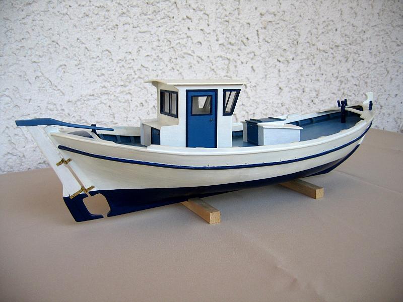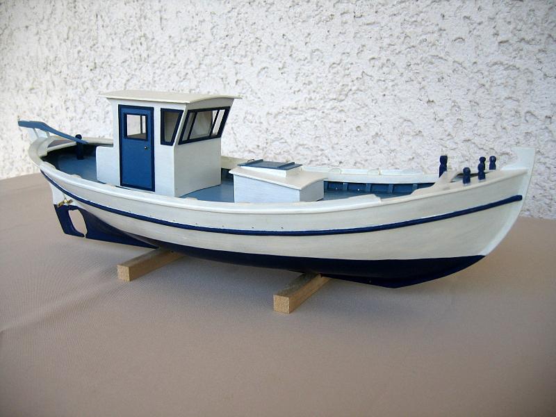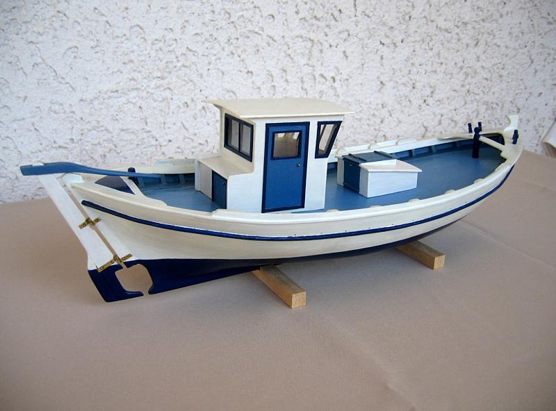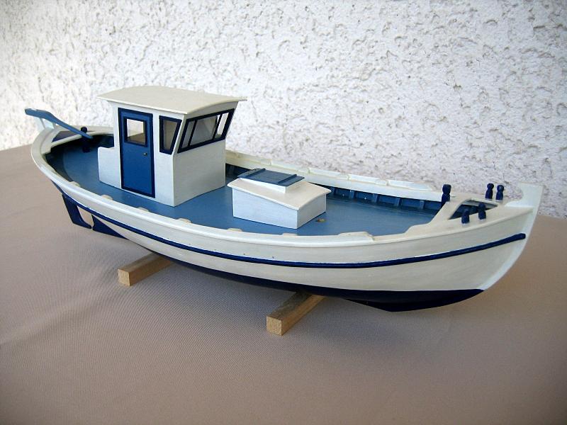 Παραδοσιακό αλιευτικό τρεχαντήρι με θαλασσινά χρώματα. Η γάστρα του μοντέλου αποτελεί ομοίωμα παραδοσιακού αλιευτικού τρεχαντηριού μήκους 12 μέτρων, το οποίο σχεδιάστηκε στη Σκιάθο το 1965. Το μοντέλο δεν έχει ακόμη ολοκληρωθεί. |