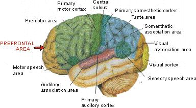 at the front of the head, we will find the prefontal area of the cerebrum.
