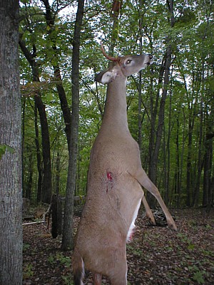 Got the 4-point (right) on my first buck hunt with a rifle, and the 3-point on my very first bow-hunt period. Perfect shot on that 3-point, too. I just got the bow in early 2002 and everybody said it would take me years to get any good with it. Well, guess they were WRONG!! Took me eight (8) shots before I could hit a pie plate, a week later I was cutting the fletchings of my arrows on follow-up shots, and when I switched back to field-tips for practicing, I pulled off a "Robin Hood" shot. Check it out!