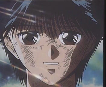 A battered Yuusuke smiling.