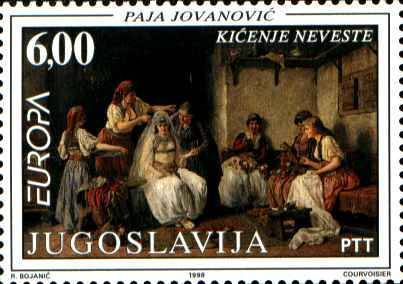 1998 Yugoslav postal authorities issued 4 stamps dedicated to national customs. The motif on the stamp of 6,00 din. value is the painting "Dressing/Adornmnet of the Bride" by Paja Jovanovic |